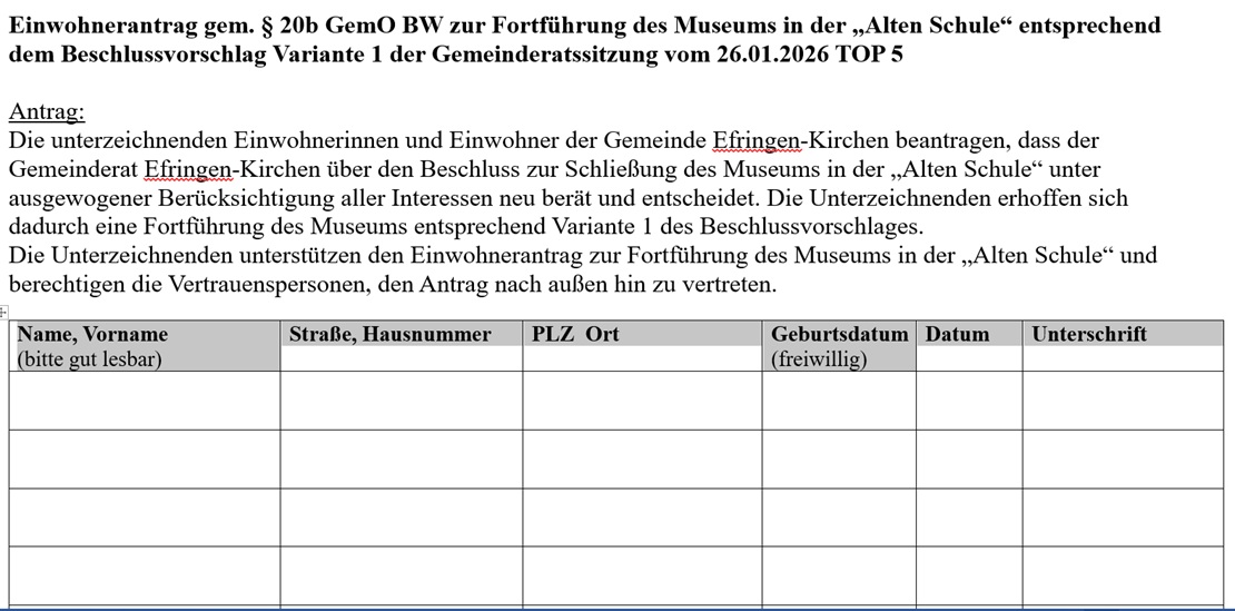 Am Freitag, den 17.04.26, zwischen 9.00 Uhr und 12.00 Uhr , können auf dem Rathausplatz die Listen für den Einwohnerantrag zur Fortführung des Museums in der "Alten Schule" unterschrieben werden. Damit kann der Gemeinderat Efringen-Kirchen über den Beschluss zur Schließung des Museums in der "Alten Schule" unter ausgewogener Berücksichtigung aller Interessen neu beraten und entscheiden.